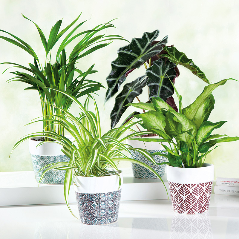 • in den Sorten z.B.: Alocasia, Chlorophytum, Dieffenbachia, Ficus Natasja, Ficus Robusta oder Areca