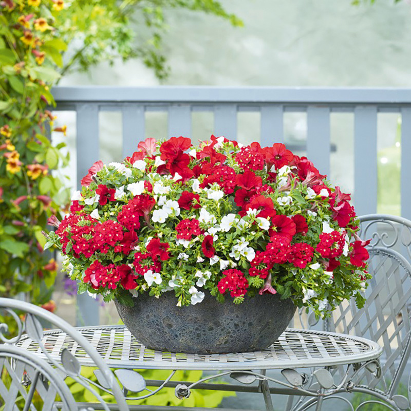 • bepflanzt mit farblich abgestimmten Verbenen, Petunien und Calibrachoa