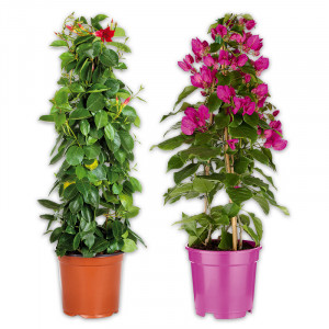 • in den Sorten z.B.: Canna blühend rot, gelb oder orange, Dipladenia rot, Bougainvillea "Vera Deep Purple" oder Passionsblume "Passiflora caerulea"