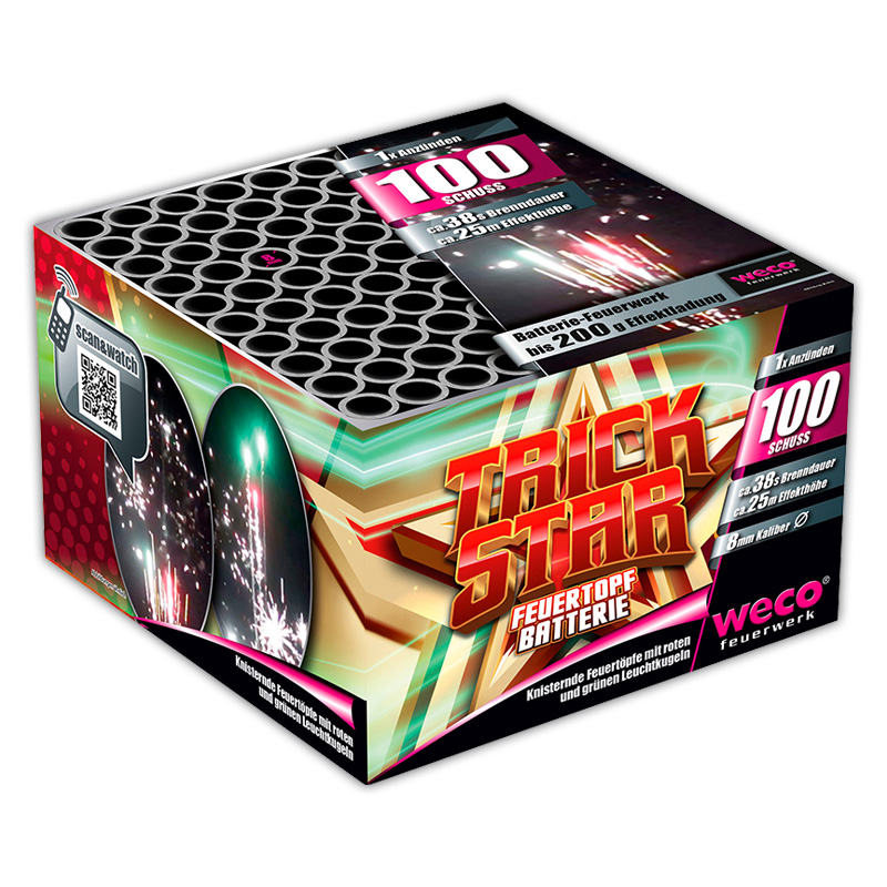 Knisternde Feuertöpfe mit roten und grünen Leuchtkugeln.