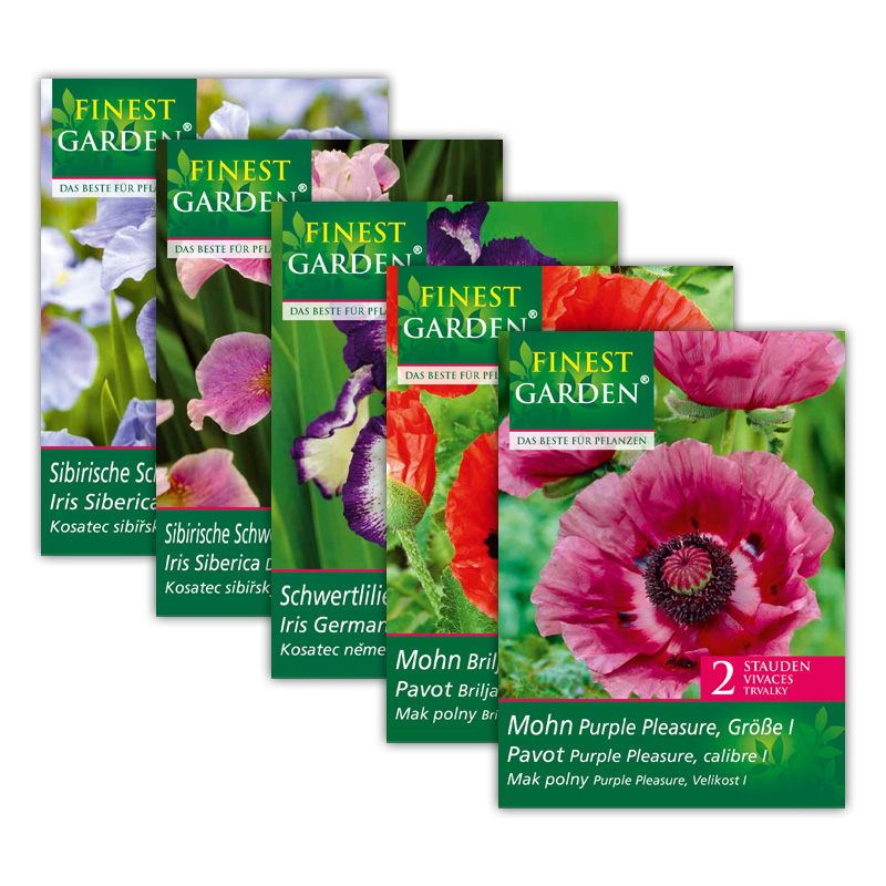 • in den Sorten z.B.: Papaver "Purple Pleasure", "Briljant", "Perry's White", "Effendi", Iris "Carribean Blue", "Edith Woolford", "Sultan's Palace", "Loop the Loop", "How Audacious", "Timped in Blue", "Dance Ballarina Dance" oder "Peacock Butterfly Mission Bay"
