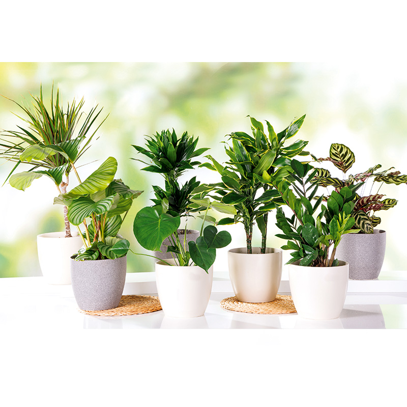 • in den Sorten z.B.: Draceana Marginata green, Draceana Deremensis-Mix (Lemon Lime/Lisa, Warnecki), Calathea-Mix, Zamioculca, Yucca Stamm mit 2 – 3 Austrieben oder Monstera Deliciosa